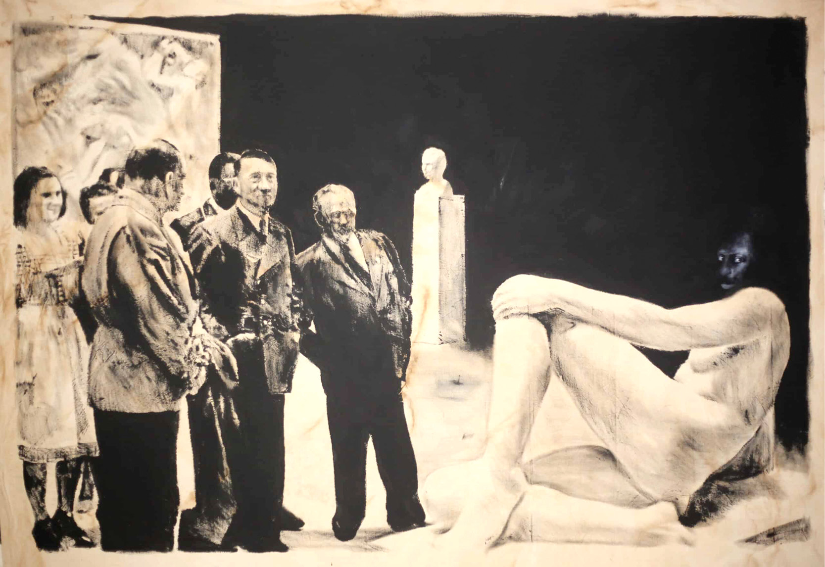 Roméo Mivekannin, La scène du régime nazi: Hitler en visite à la Maison de l’art allemand, temple de l’art officiel nazi à Munich (Szene aus der Zeit des NS-Regimes: Hitler bei einem Besuch des Hauses der Deutschen Kunst, dem Zentrum der offiziellen NS-Kunst in München), 1942, 2025 ©